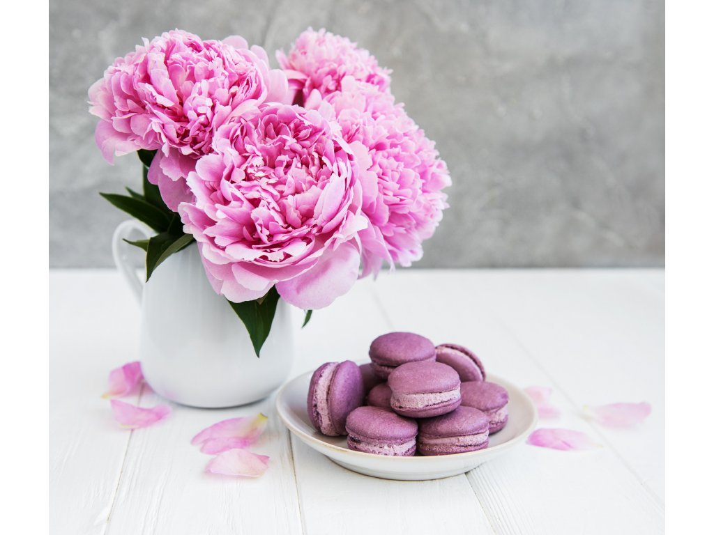 Diamantové maľovanie - Ružové pivonky s makrónkami