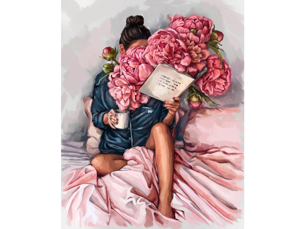 Diamantové maľovanie - Žena s knihou a kvetom pivonky