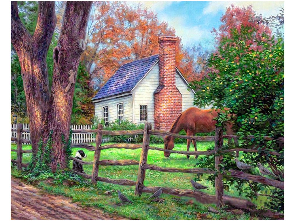 Malebný obraz, v ktorom je ešte veľa čo objavovať. Pred vidieckym domom s tehlovým komínom sa pasie hnedý kôň. Jeho kroky stráži verný čierno-biely pes. Návštevníci vtáčieho kráľovstva sa usádzajú na drevenom plote a zelenej tráve. Veverička lezie po kôre statného stromu do svojho úkrytu.Dodatočné parametre